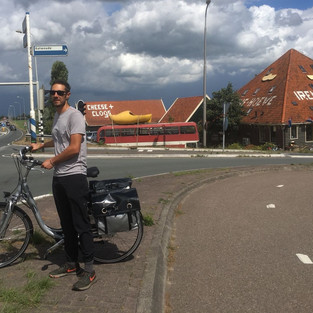 3) Take the train to Utrecht, Netherlands. Spend four days with “cool cousin” Kelli (we’re not related) biking through quaintness including a Glamping stop with Overland Bikers Tristan and Belen who I met in Osh. This stop was in a town that is the Mill Valley, CA of The Netherlands. Then went went through the Dutch Bible belt to a campground where old people were playing Bingo and I paid $4 to call Alaska Airlines to extend my ticket. Meet Marce and Charlie from Surfcamp for lunch in a warehouse district in Amsterdam.
