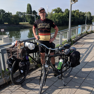 7) Plane back to Frankfurt and train to campground along the Main River with Long Haul Trekkers (Dave, Jen, two dogs) and BigRigistan (Adam and a Pomeranian) preparing to cycle.